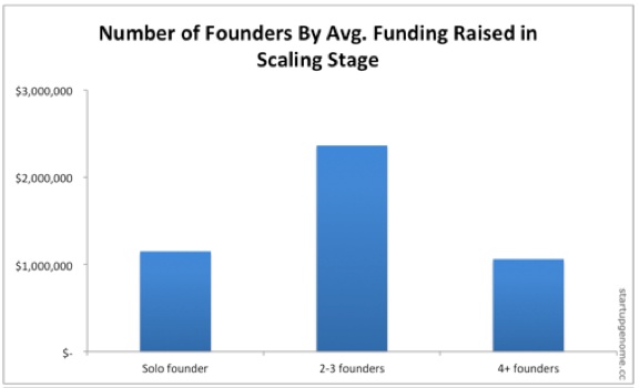 ● 單獨立創(chuàng)始人比2-3人的創(chuàng)始團(tuán)隊平均少籌集到50%的資金。一個原因是在籌資期間,創(chuàng)始人要兼顧產(chǎn)品,商業(yè)和籌資,精力必然分散。