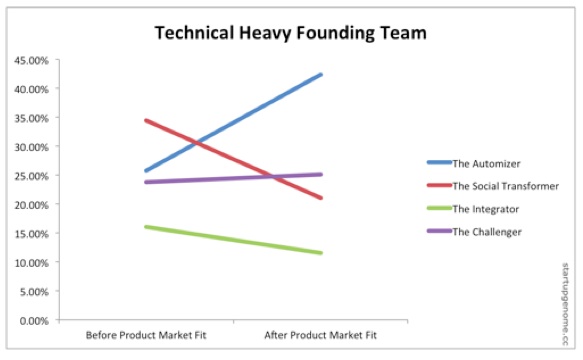 在我們的數據中,35%的偏重商業的創始團隊在產品適應市場之前選擇了“自主型“,但在產品適應市場之后只有12%的偏重商業的創始團隊選擇了”自主型“。這說明偏重商業型的創始團隊并不太適應”自主型“的創業公司。