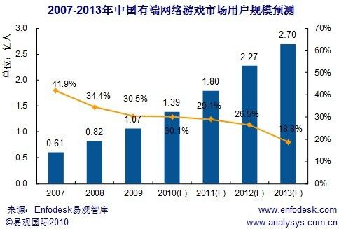 易觀國(guó)際EnfoDesk易觀智庫(kù)數(shù)據(jù)顯示:2010年,中國(guó)有端網(wǎng)絡(luò)游戲市場(chǎng)擁有活躍付費(fèi)用戶7100萬(wàn),環(huán)比增長(zhǎng)21%,活躍付費(fèi)用戶月度ARPU為 37元,環(huán)比下滑0.1%。至2013年,這兩組數(shù)據(jù)將分別達(dá)到1.2億活躍付費(fèi)用戶,和45元月度ARPU。