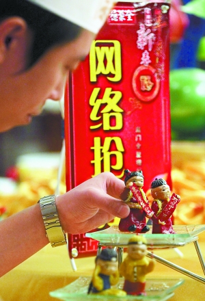 昨天,一名全聚德前門店的廚師正在布置將在網絡上展示的年夜飯餐臺擺設。離春節還有20多天,京城不少餐飲網站已開始年夜飯搶訂活動,與往年不同的是,顧客不僅可以在網上訂位子,部分餐館還可以預訂飯菜的品種、數量和做法。